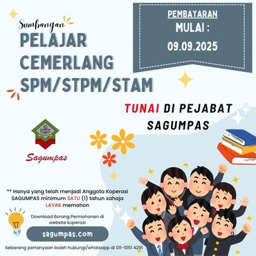 PEMBAYARAN SUMBANGAN PELAJAR CEMERLANG 2025 SECARA TUNAI DI PEJABAT SAGUMPAS BERMULA 09.09.2025.